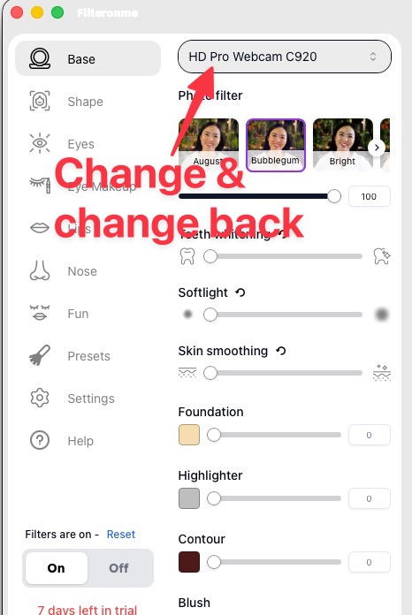 Make sure the FilterOnMe app is open and running (you can see yourself in the preview), before using it in your main application. On Mac (latest version), you can close the Filteronme app to save resources.
